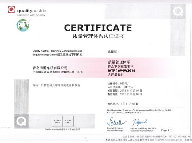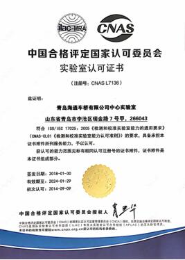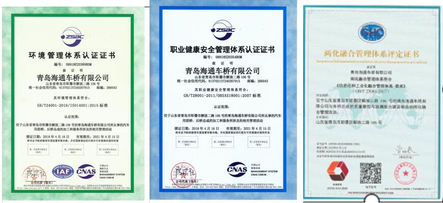 青島海通車(chē)橋有限公司成立于1994年,注冊(cè)資金2000萬(wàn)元,位于山東省青島市即墨區(qū)解放二路106號(hào)。公司先后獲得“中國(guó)誠(chéng)信企業(yè)”、“國(guó)家級(jí)認(rèn)可實(shí)驗(yàn)室”、“高新技術(shù)企業(yè)”、“山東省企業(yè)技術(shù)中心”、“山東省守合同重信用企業(yè)”、“山東省著名商標(biāo)”、“質(zhì)量信用AAAAA級(jí)企業(yè)”、“AAA級(jí)企業(yè)信用等級(jí)”等榮譽(yù)。先后通過(guò)了質(zhì)量、環(huán)境、職業(yè)健康安全、兩化融合等管理體系認(rèn)證。